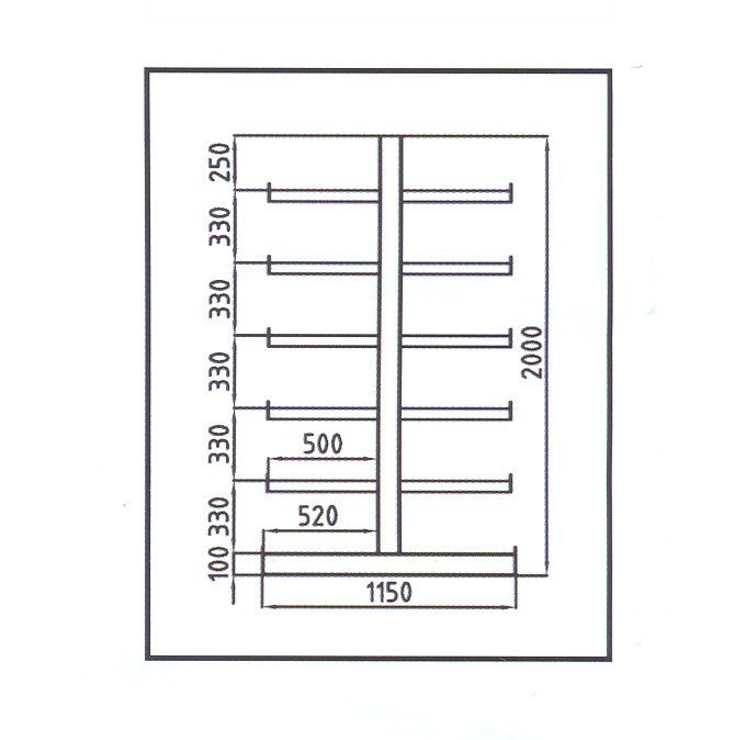 Medium load racks for standing and lying long material. Height 2000 - 3000 mm, width 1000 or 1300 mm, depth 500 or 800 mm, number of arms 4 - 5 per post, arm load capacity 250 or 430 kg, one-sided web load capacity 1250 - 2340 kg, rack weights between 50 - 202 kg. Color RAL 5010 blue. Only one web, serves as an extension of the base racks.