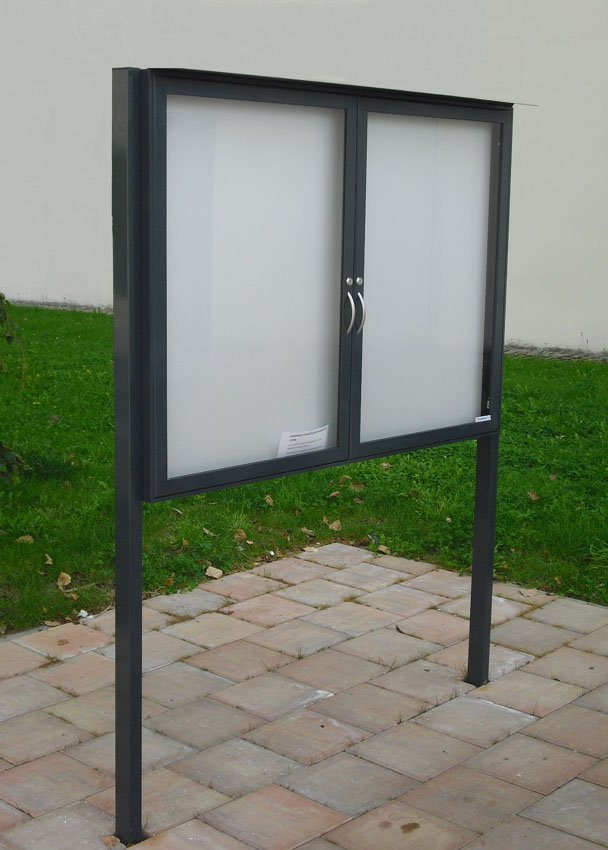 Double-wing showcase suitable for both exterior and interior use. Vandal resistant. Surface treatment of the structure with high-layer anodized or powder firing paint. Basic color design without extra charge - silver structure, white background. Dimensions h. 1000 x w. 1050 x d. 40 mm.