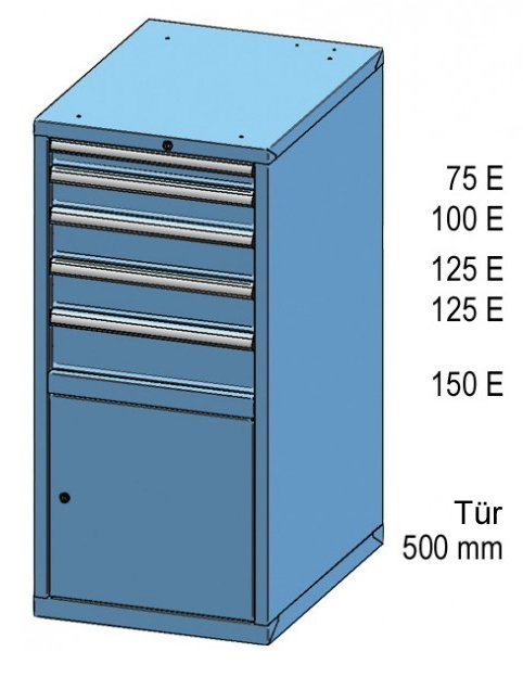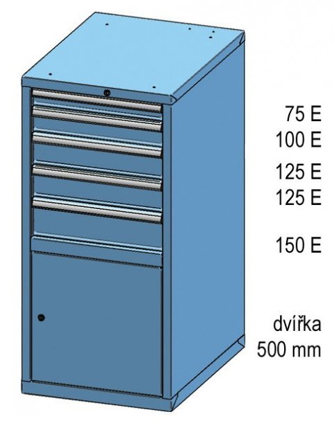 Drawer cabinet, 5x drawers, 1x door + 1x adjustable shelf, height 1215, width 578, depth 780 mm. Internal dimensions of the drawer 459 x 612 mm.