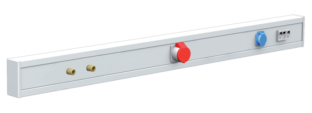 Socket strip with one electric socket 400V / 16A, one el. 230V / 16A socket, two quick connectors for air connection and a circuit breaker of your choice.
