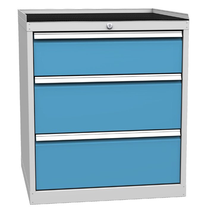 Six-drawer workshop cabinet, width 720, height 1030, depth 700 mm. Drawer extension 80%, drawer load capacity 80 kg, central lock. 1x drawer 60, 2x 90, 2x 180, 1x 240 mm. Body color RAL 7035 light gray. In stock in light gray body, blue drawers.