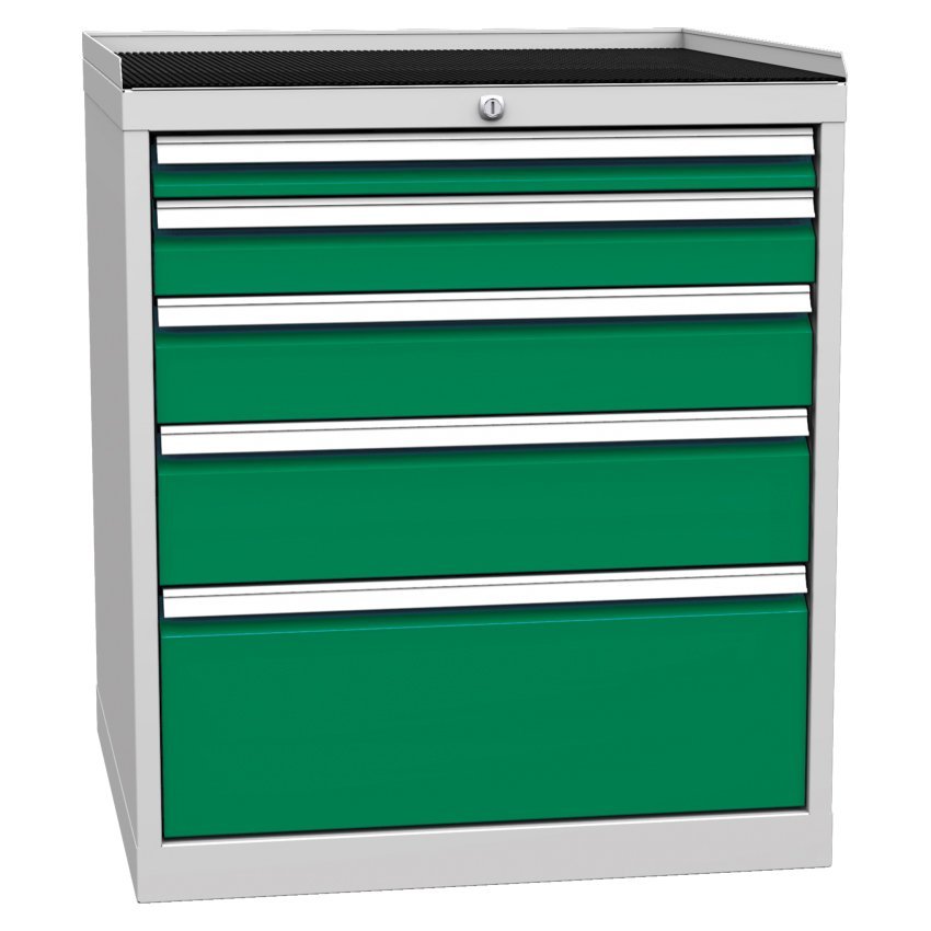 Five-drawer workshop cabinet, width 720, height 840, depth 700 mm. Drawer extension 80%, drawer load capacity 80 kg, central lock. 1x drawer 60, 1x 90, 1x 120, 1x 180, 1x 210 mm. Body color RAL 7035 light gray.