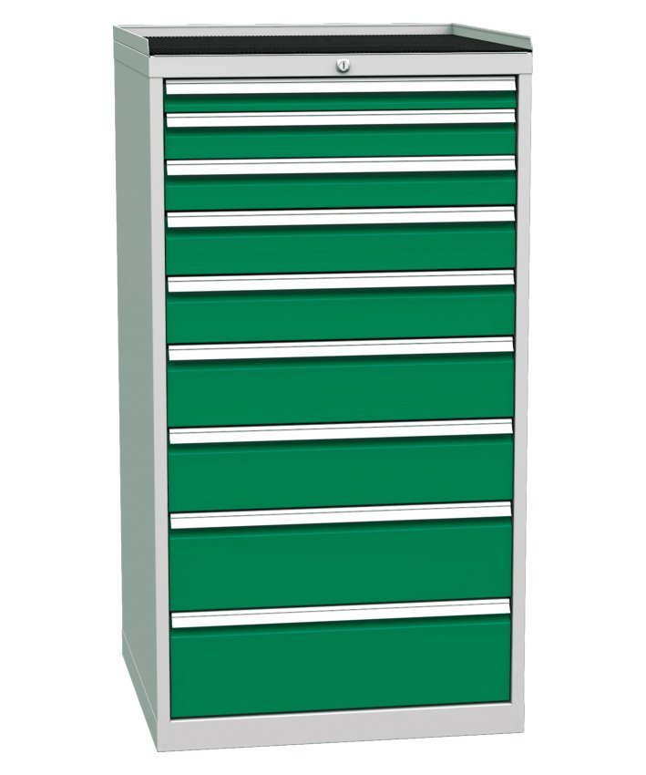 Nine-drawer workshop cabinet, width 720, height 1350, depth 700 mm. Drawer extension 80%, drawer load capacity 80 kg, central lock. 1x drawer 60, 2x 90, 2x 120, 2x 150, 2x 180 mm. Body color RAL 7035 light gray.