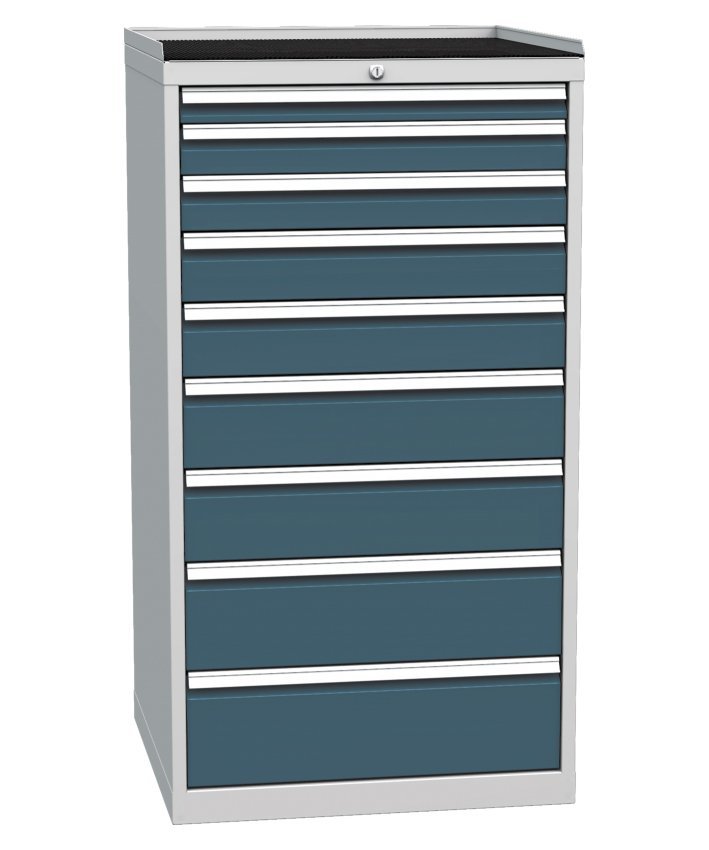 Nine-drawer workshop cabinet, width 720, height 1350, depth 700 mm. Drawer extension 80%, drawer load capacity 80 kg, central lock. 2x drawer 60, 2x 90, 2x 120, 2x 180, 1x 240 mm. Body color RAL 7035 light gray.