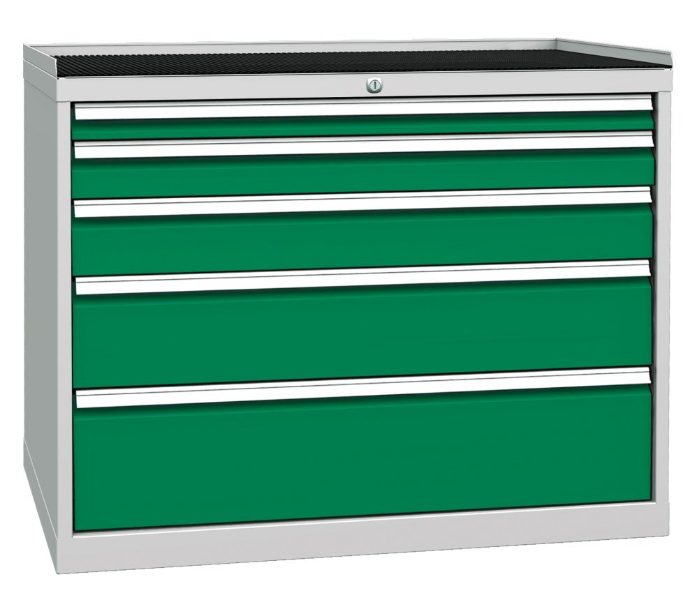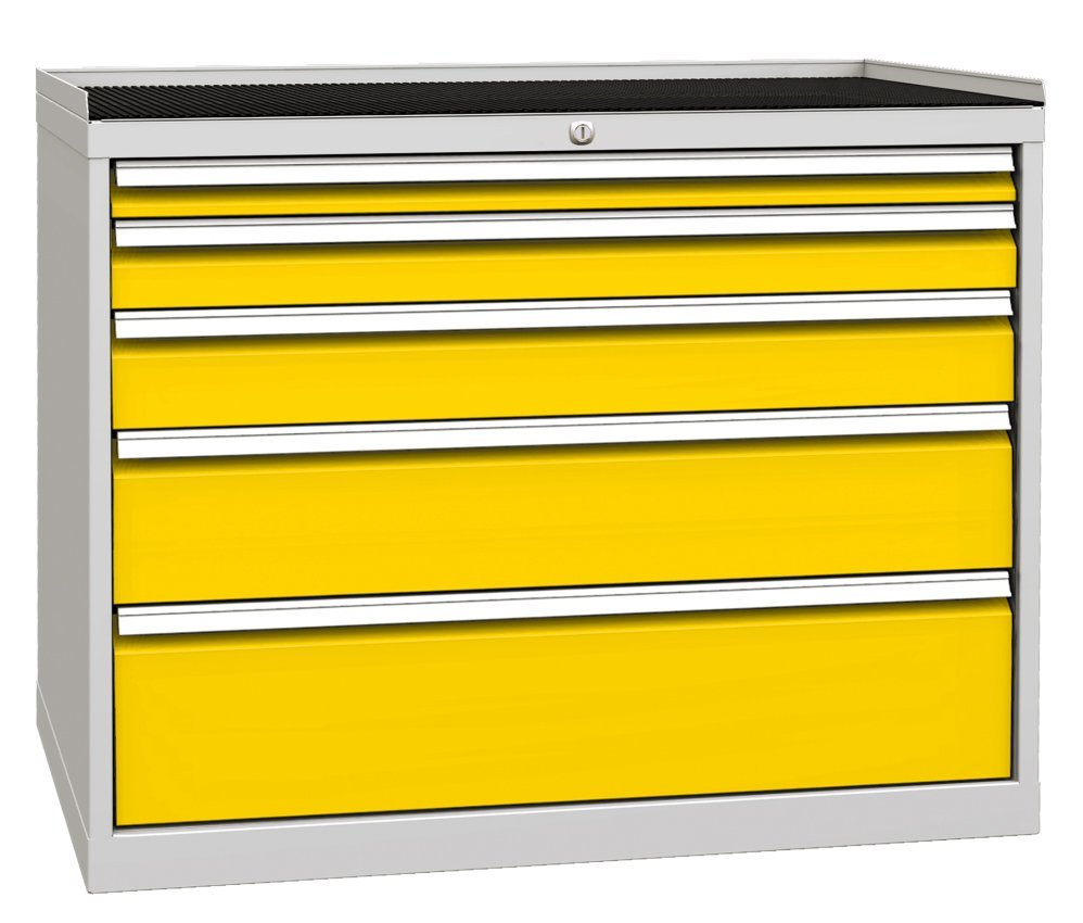 Five-drawer workshop cabinet, width 1000, height 840, depth 700 mm. Drawer extension 80%, drawer load capacity 80 kg, central lock. 1x drawer 60, 1x 90, 1x 120, 1x 180, 1x 210 mm. Body color RAL 7035 light gray.