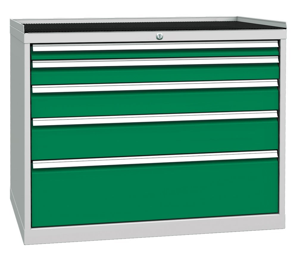 Five-drawer workshop cabinet, width 1000, height 840, depth 700 mm. Drawer extension 80%, drawer load capacity 80 kg, central lock. 1x drawer 60, 1x 90, 1x 120, 1x 150, 1x 240 mm. Body color RAL 7035 light gray.