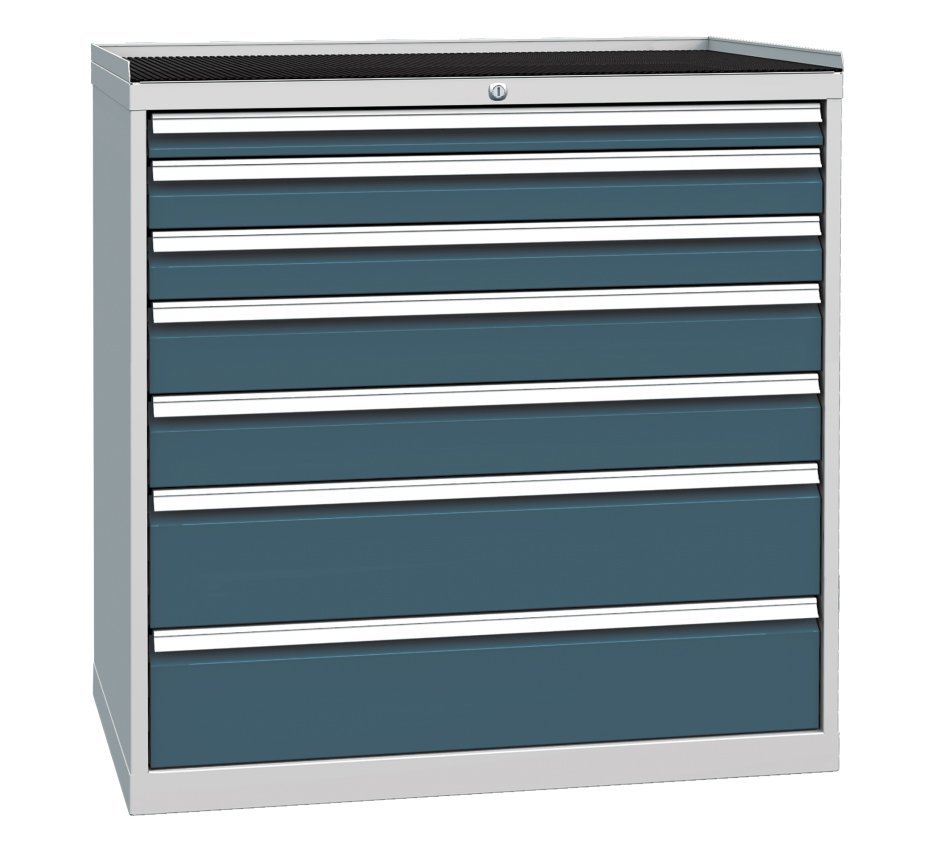 Seven-drawer workshop cabinet, width 1000, height 1030, depth 700 mm. Drawer extension 80%, drawer load capacity 80 kg, central lock. 1x drawer 60, 2x 90, 2x 120, 2x 180 mm. Body color RAL 7035 light gray.
