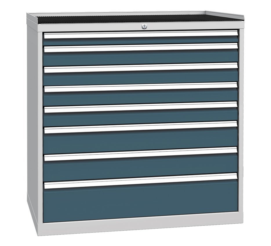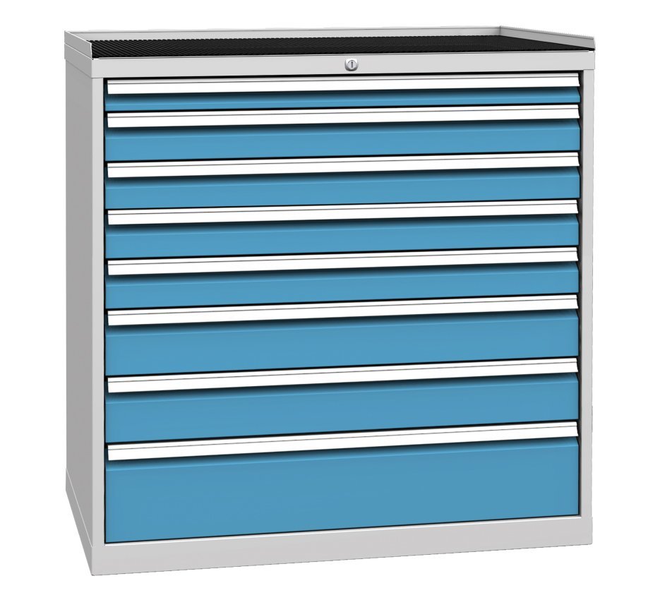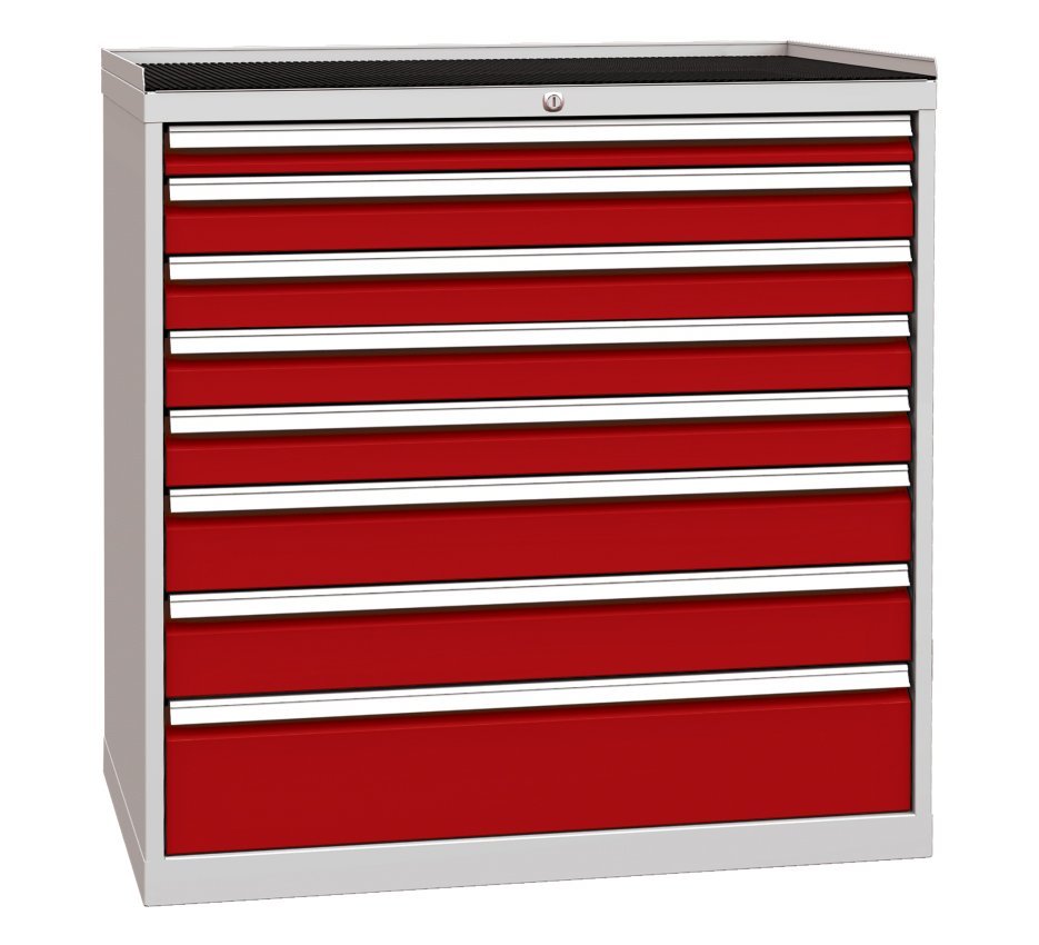 Eight-drawer workshop cabinet, width 1000, height 1030, depth 700 mm. Drawer extension 80%, drawer load capacity 80 kg, central lock. 1x socket 60, 4x 90, 2x 120, 1x 180 mm. Body color RAL 7035 light gray.