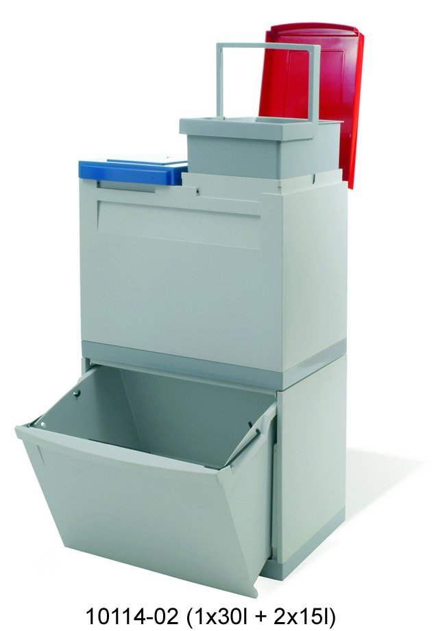 Flexible and variable. The sector principle allows you to create different reports. The modules placed on top of each other are fixed to each other for stability. The inner baskets can be easily removed, emptied and cleaned. The modules can be supplemented with wheels. Volume 1 x 30 l + 2 x 15 l.