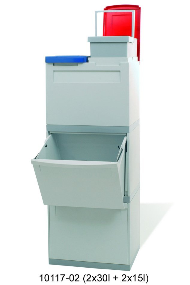 Flexible and variable. The sector principle allows you to create different reports. The modules placed on top of each other are fixed to each other for stability. The inner baskets can be easily removed, emptied and cleaned. The modules can be supplemented with wheels. Volume 2 x 30 l + 2 x 15 l.