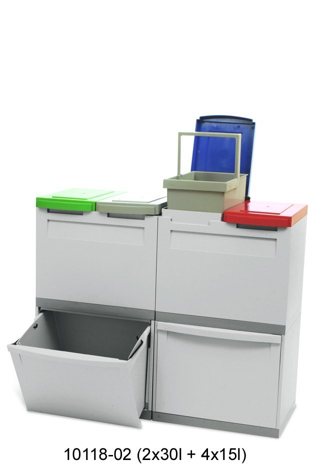 Flexible and variable. The sector principle allows you to create different reports. The modules placed on top of each other are fixed to each other for stability. The inner baskets can be easily removed, emptied and cleaned. The modules can be supplemented with a cart with wheels. Volume 2 x 30 l + 4 x 15 l.