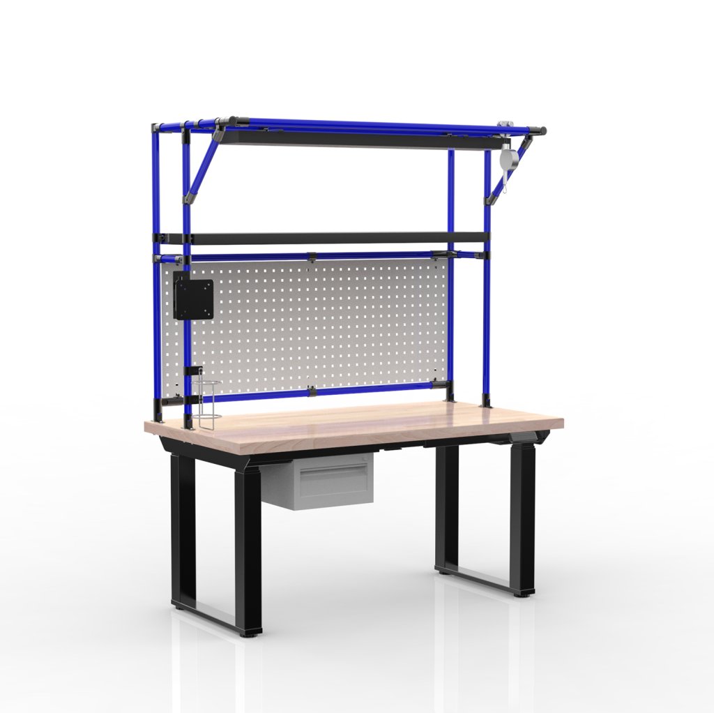 Electric Height-adjustable work desk with a worktop made of beech jointed panel. The desk includes a perforated panel for hanging boxes or tools, a container with one drawer, a galvanized shelf, a monitor holder, a holder for 2-liter PET bottles, and LED lighting. The work surface height is adjustable within the range of 700 - 1350 mm. Load capacity with even distribution is 250 kg. Dimensions: 1800 - 2450 x 1400 x 750 mm.