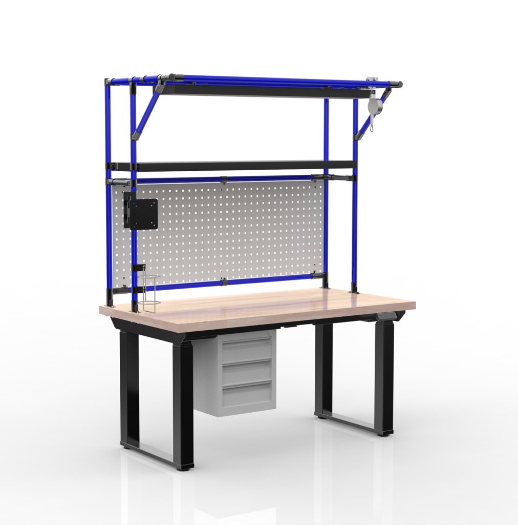 Electric height-adjustable work desk with a worktop made of beech jointed panel. The desk includes a perforated panel for hanging boxes or tools, a container with three drawers, a galvanized shelf, a monitor holder, a holder for 2-liter PET bottles, and LED lighting. The work surface height is adjustable within the range of 700 - 1350 mm. Load capacity with even distribution is 250 kg. Dimensions: 1800 - 2450 x 1400 x 750 mm.