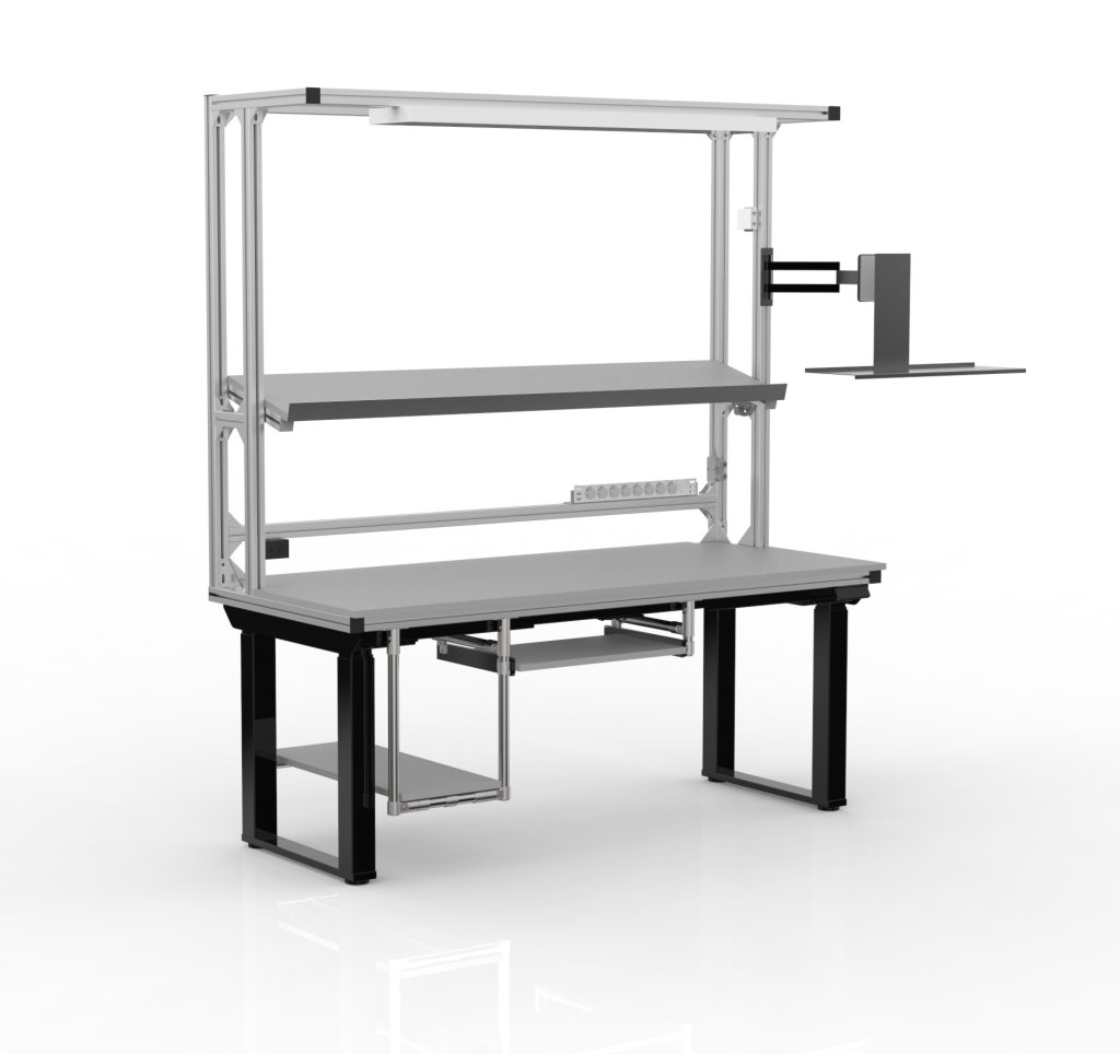• Under-mounted shelves, monitor and keyboard holder, LED lighting