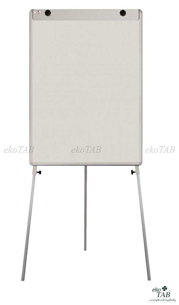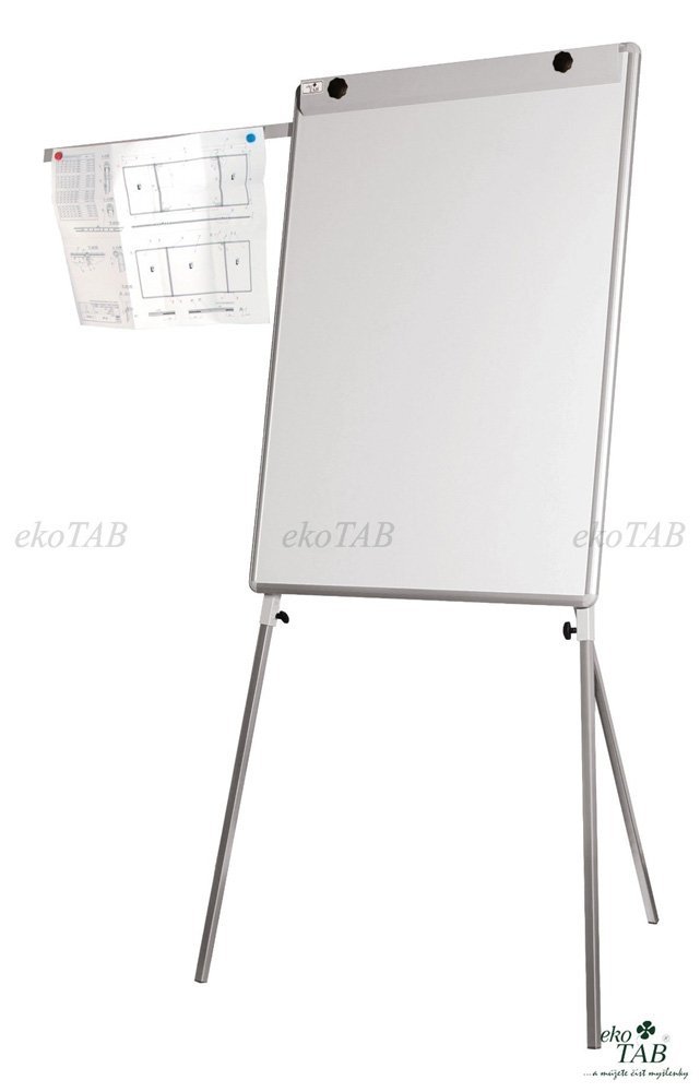 White lacquered magnetic board on a tripod. The board is height adjustable. Size 100 x 75 (150) cm. Supplied with a storage rail for markers, a rail for fixing paper blocks and arms for hanging paper sheets.