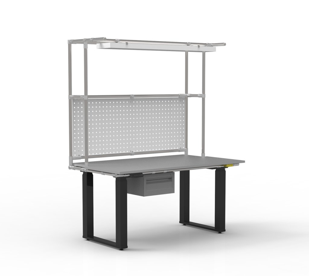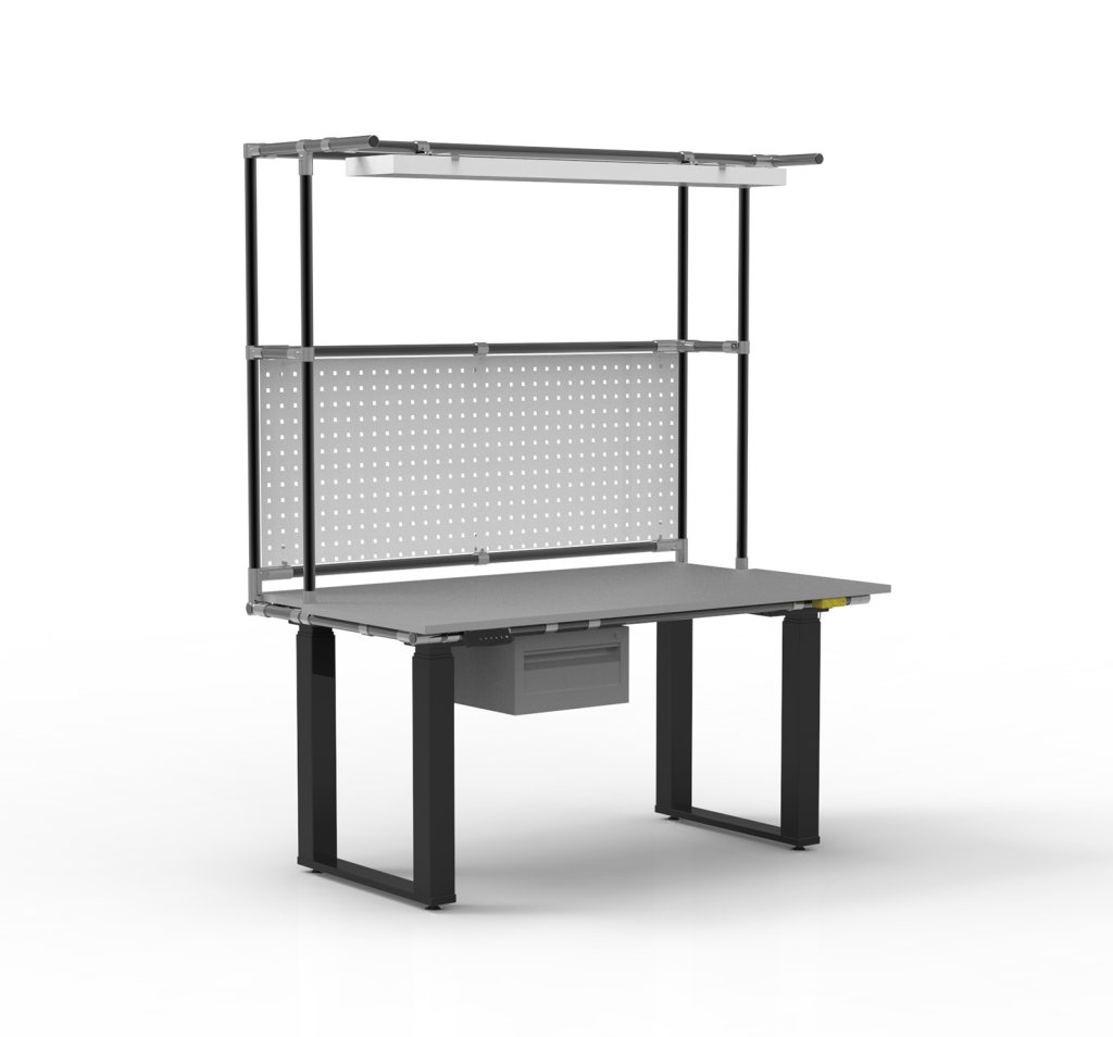 Ergonomic ESD table for electrostatically protected workstations with a practical extension made from a tubular system. The table includes LED lighting, a perforated panel, and a drawer unit with one drawer. It is equipped with an intuitive controller with three programmable height presets, enabling easy ergonomic adjustment of the working surface within the range of 680 – 1330 mm.