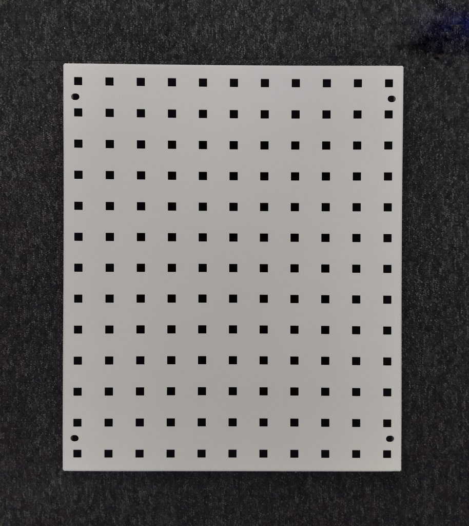 ESD perforated panel with rounded edges. Holes for mounting in a tubular system or on the wall. Ideal for hanging tool holders and quick access to fasteners. The ESD design provides reliable protection against electrostatic discharge. Dimensions 935.5 x 500 mm, thickness 1,4 mm, square holes 10 x 10 mm, hole spacing 38 x 38 mm, color gray RAL 7035.