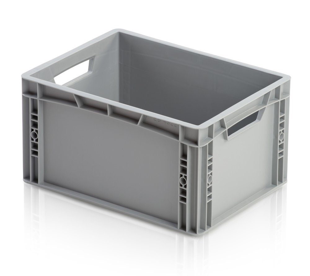 Stackable Euro crate suitable for long-term storage and production. It is stable during transport, compatible with Euro pallets. It has a solid bottom and sides with closed handles. Grey color. Volume 54 l.