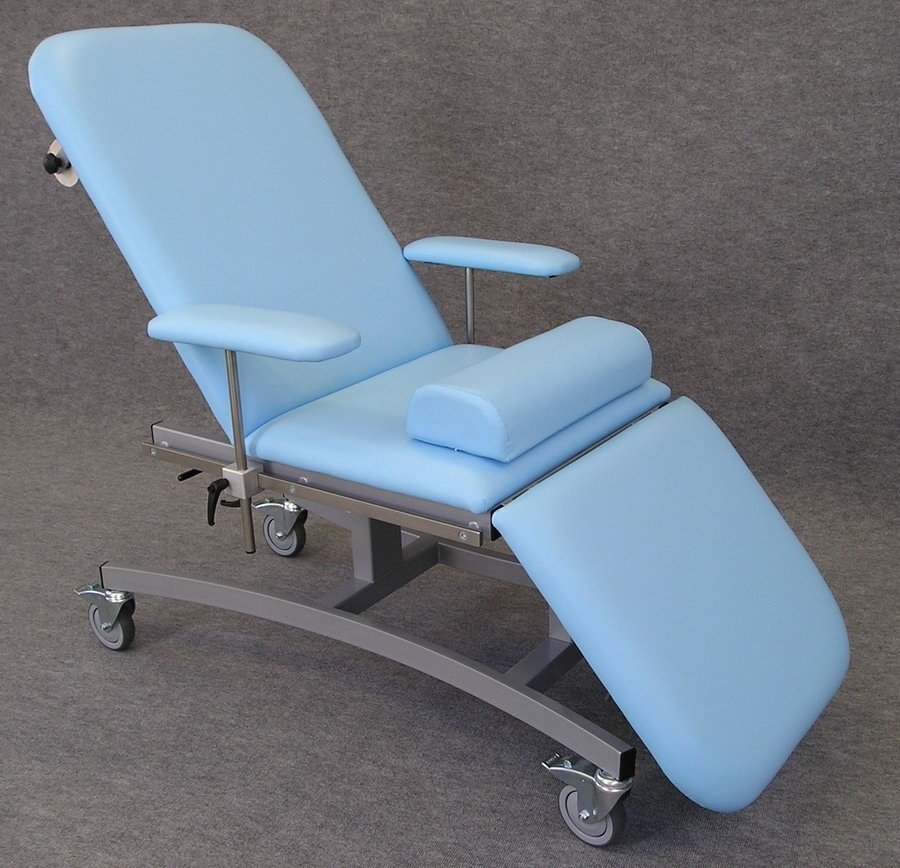 Multi-purpose lounger. The metal structure is surface treated with powder technology in white. Bed surface - washable leatherette. On the sides of the bed, there are stainless steel euro rails for attaching armrests, possibly an infusion stand or other accessories. Price without armrests.