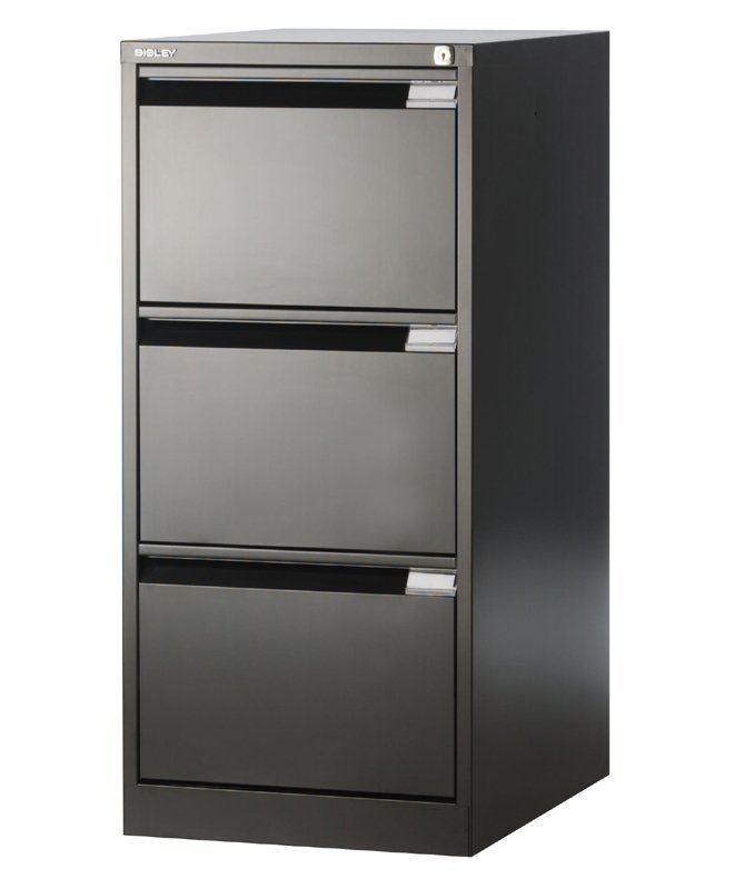 Three-drawer metal filing cabinet for documents or hanging files in A4 or Foolscap format, width 470, height 1016, depth 622 mm,