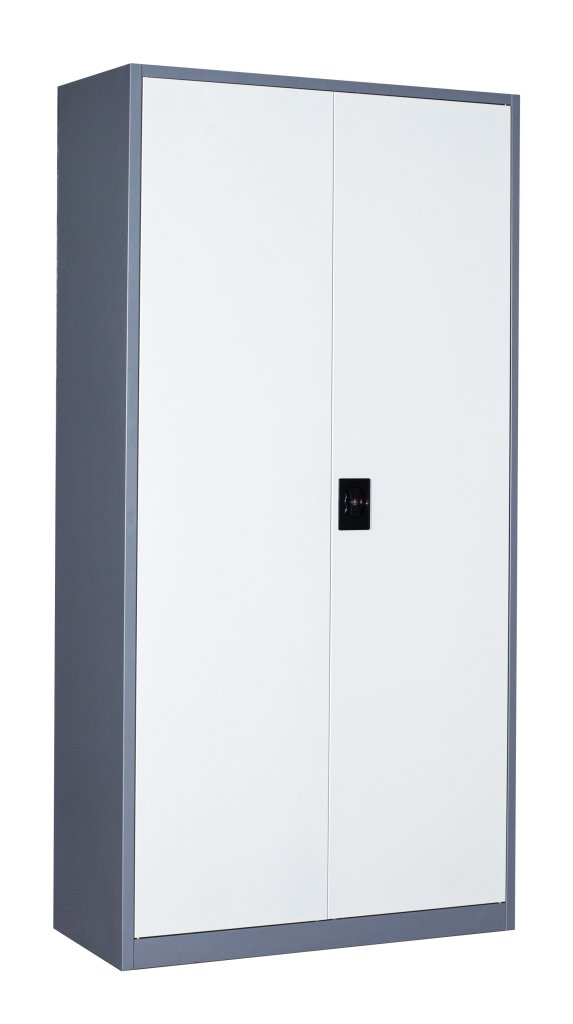Two-door dismantled cabinet made of sheet steel 0.6 mm thick. Height 1850 x width 900 x depth 390 mm, 4 x shelves, cylinder lock with two keys. Surface treatment with powder paint - dark gray body, white doors.