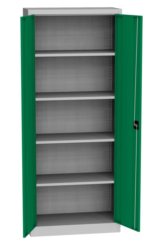 Cabinet with solid doors, height 1950 x width 505 x depth 400 mm. Locking on a cylinder lock with a wheelbase mechanism. 4 x adjustable steel shelves (load capacity 60 kg). The possibility of replacing solid doors with doors with glass filling, with wire filling or laminate doors in the shade of beech, birch or cherry. Body color RAL 7035 light gray.