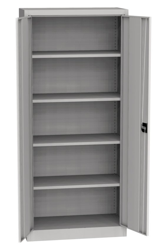 Cabinet with solid doors, height 1950 x width 505 x depth 400 mm. Locking on a cylinder lock with a wheelbase mechanism. 4 x adjustable steel shelves (load capacity 60 kg). The possibility of replacing solid doors with doors with glass filling, with wire filling or laminate doors in the shade of beech, birch or cherry. Body color RAL 7035 light gray.