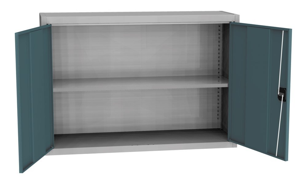 Cabinet with solid doors, height 800 x width 505 x depth 400 mm. Locking on a cylinder lock with a wheelbase mechanism. 1 x adjustable steel shelf (load capacity 60 kg). The possibility of replacing solid doors with doors with glass filling, with wire filling or laminate doors in the shade of beech, birch or cherry. Body color RAL 7035 light gray.