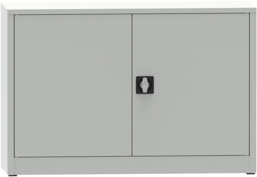 Two-door metal welded cabinet, width 1200, height 800, depth 400 mm, 1x adjustable shelf. Body color RAL 7035 light gray, doors RAL 7035 light gray and RAL 5012 blue.
