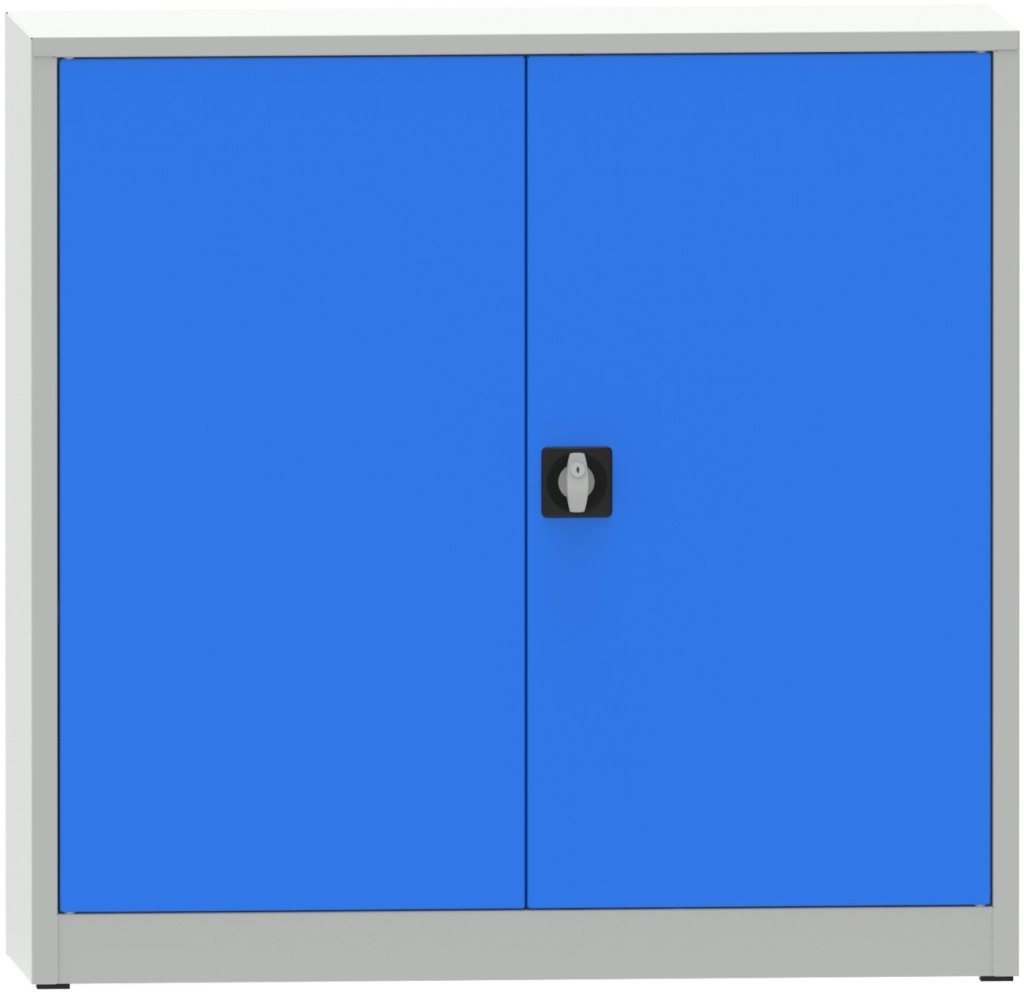 Two-door metal welded cabinet, width 1200, height 1150, depth 500 mm, 2 adjustable shelves. Body color RAL 7035 light gray, doors RAL 7035 light gray and RAL 5012 blue.
