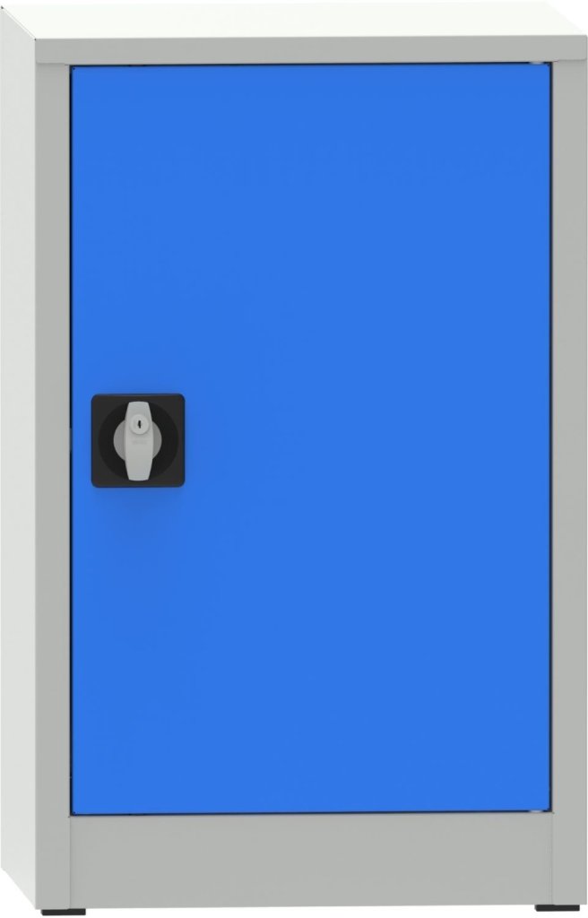 Metal welded cabinet, width 508, height 800, depth 600 mm, 1x adjustable shelf. Body color RAL 7035 light gray, doors RAL 7035 light gray and RAL 5012 blue.