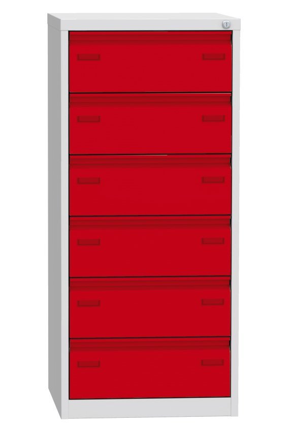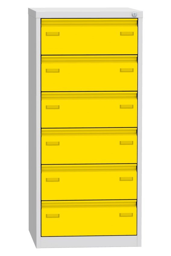 Cardboard for A5 formats, single drawer (there are 2 compartments in the drawer). Height 265 x width 560 x depth 600 mm. Metal body in light gray RAL 7035, drawer in different colors, cylinder lock.
