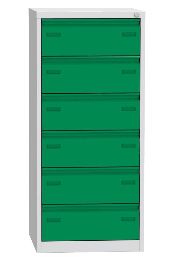 Postcard box for A5 formats with six drawers (there are 2 compartments in each drawer). Height 1250 x width 560 x depth 600 mm. Metal body in light gray RAL 7035, drawers in different colors, central lock.