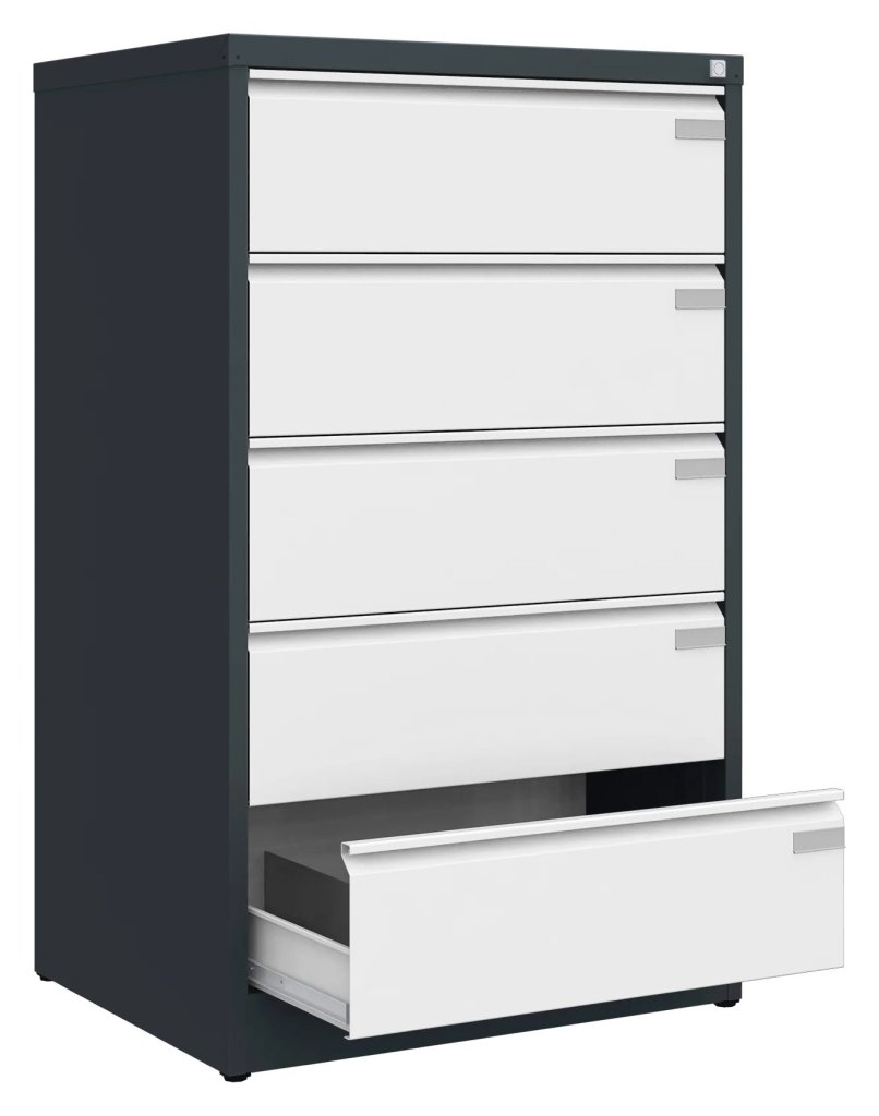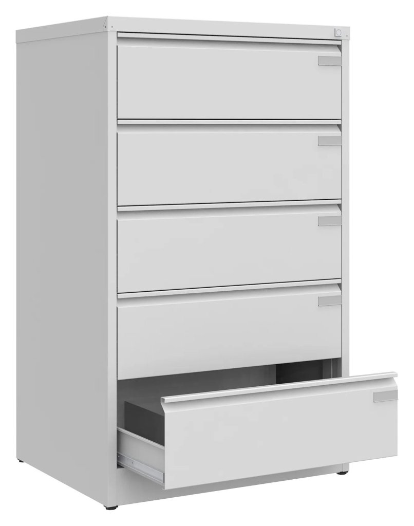 For storing A5 documents horizontally. Welded body, 90% drawer extension. Central cylinder lock. Surface treatment with powder coating, 16 color shades to choose from. Dimensions in mm (H x W x D) 605 x 545 x 630.