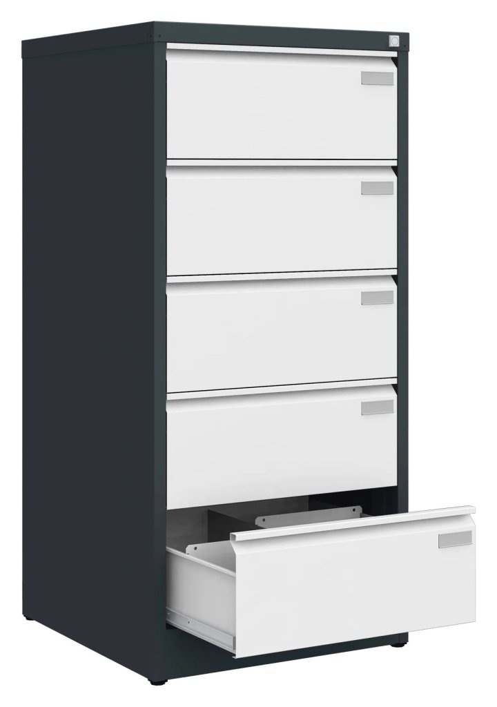 For storing B5 documents horizontally. Welded body, 90% drawer extension. Central cylinder lock. Surface treatment with powder coating, 16 color shades to choose from. Dimensions in mm (H x W x D) 1285 x 610 x 630.