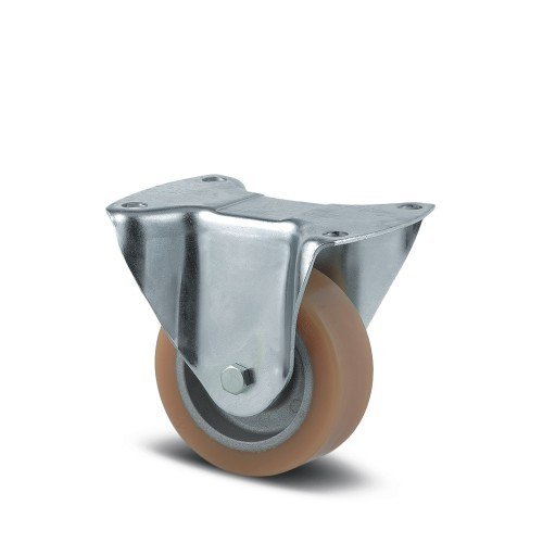 Fixed instrument wheel with a diameter of 125 mm, fork made of pressed steel, galvanized, wheel attached with a central screw and nut, attachment with a plate. Wheel center made of aluminum alloy, tread cast from polyurethane, precision ball bearing.