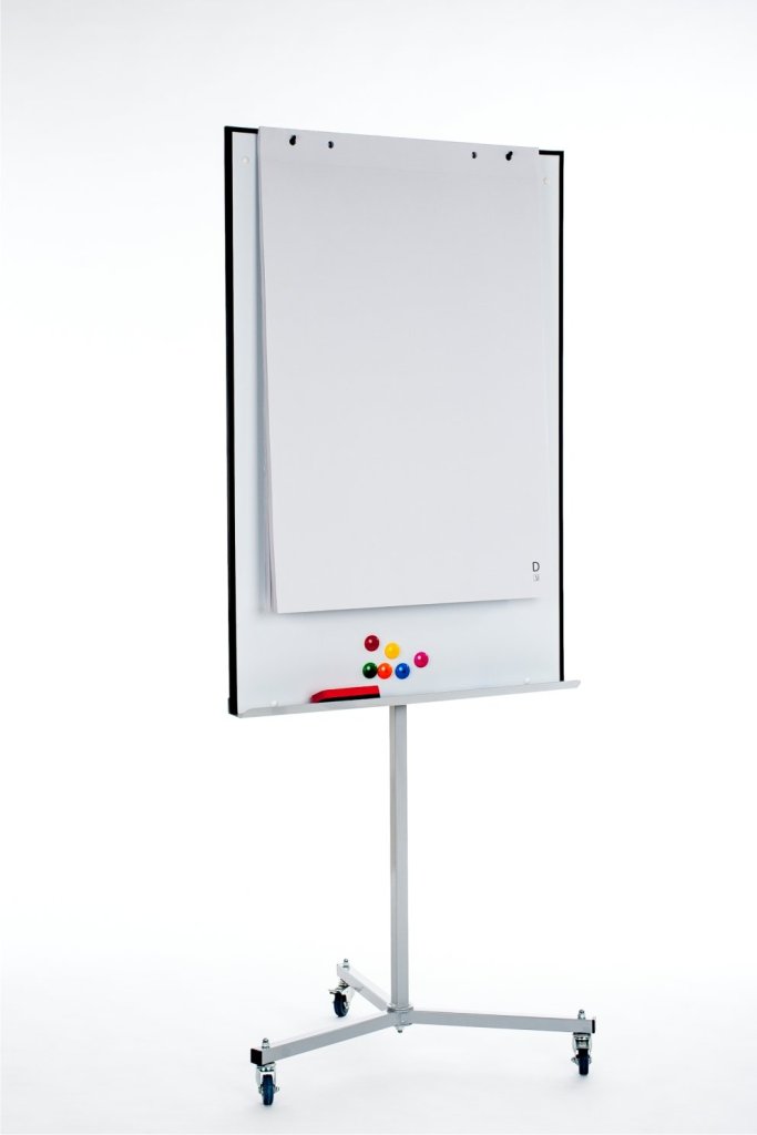 White lacquered magnetic board on a tripod. The board is height adjustable. Size 100 x 150 cm. Supplied with a storage rail for markers, a rail for fixing paper blocks and arms for hanging paper sheets.