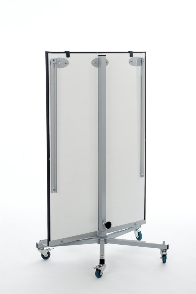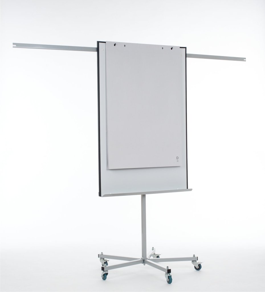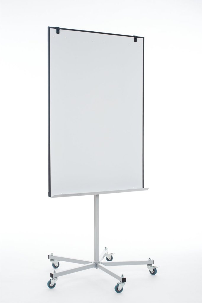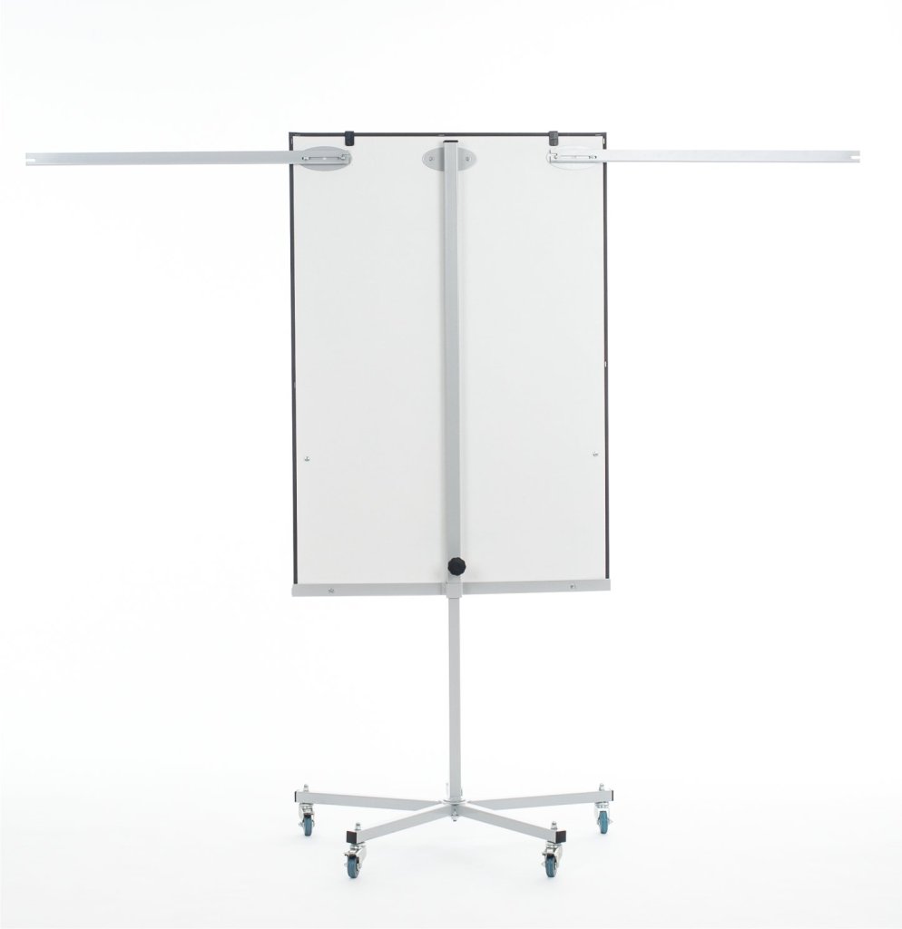 Mobile folding flipchart with magnetic surface. Very stable base with five wheels and manually adjustable height. Hooks for full description and parameters