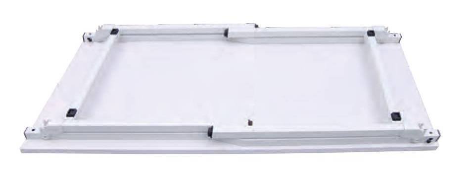 Folding conference table on a metal base, board size 1200 x 600 mm, construction color RAL 7035, board color white. The work surface is made of double-sided laminated chipboard with a thickness of 25 mm, lined with an ABS edge. The height of the table top when unfolded is 720 mm. Table height when folded 95 mm. Safety plastic caps. Quick and safe unfolding and folding of the table.