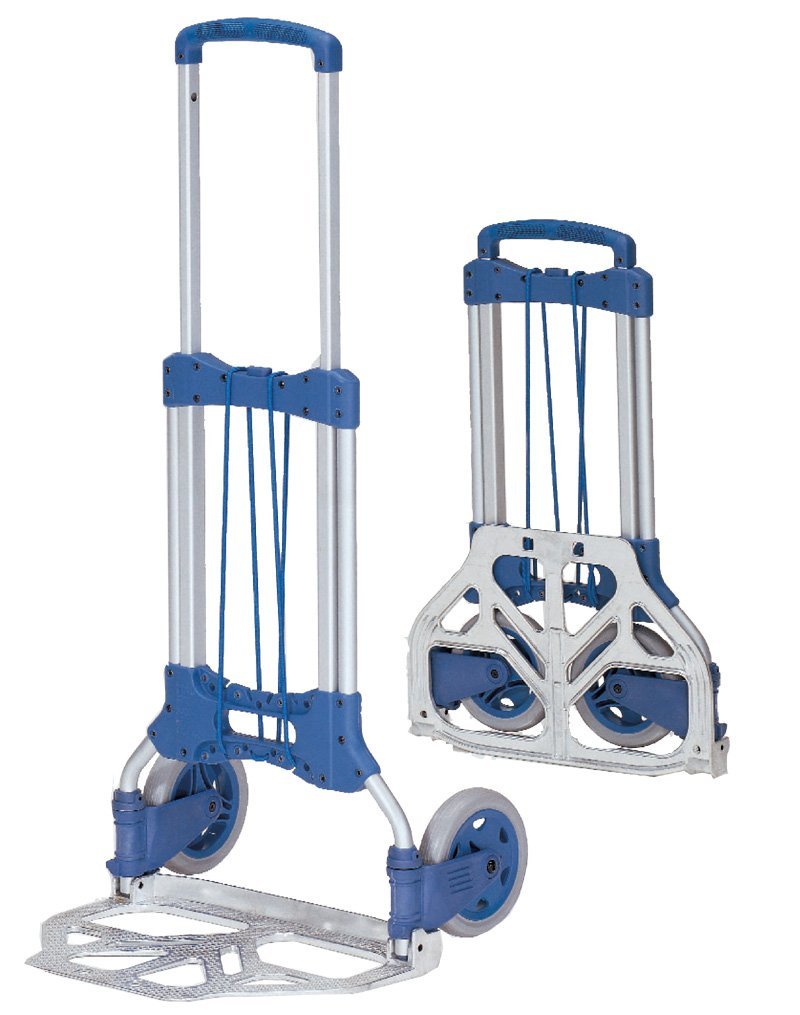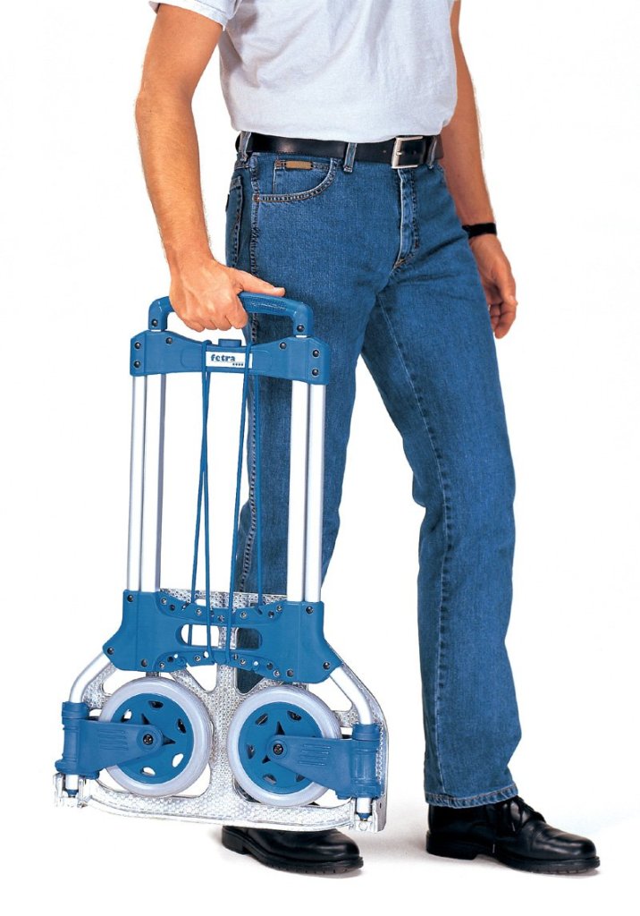 Folding aluminum handcart made in Germany, folding shovel made of aluminum, aluminum-steel construction, some parts made of blue plastic, handle made of pleasant non-slip material. A system of fastening straps for catching the load. Wheels made of grey-blue polymer, non-staining.