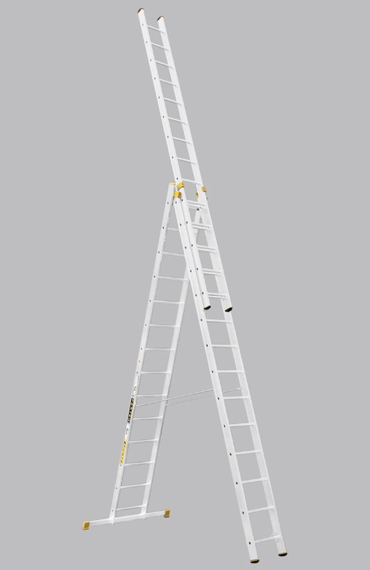 Forte three-piece universal ladder. Number of partitions 3x12, max. extendable length 8.65 m, width 484 mm, yellow-black ends. These ladders are made to meet high durability and reliability while keeping the weight as low as possible. Maximum load capacity 150 kg.