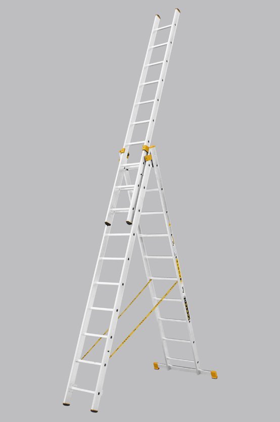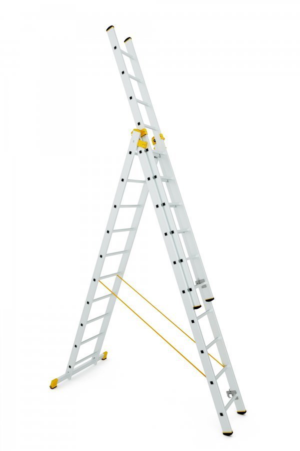 Forte three-piece universal ladder. Number of partitions 3x14, max. extendable length 10.34 m, width 484 mm, yellow-black ends. These ladders are made to meet high durability and reliability while keeping the weight as low as possible. Maximum load capacity 150 kg.