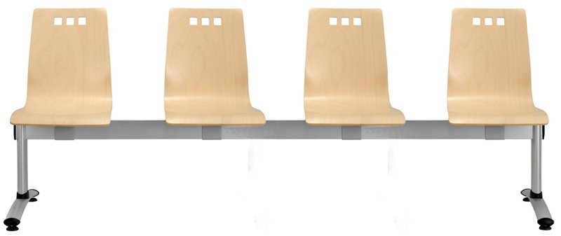 Berni five-seater, black or gray metal frame, total width 2600 mm. Beech plywood shell in several shades, possibility of upholstered seat and backrest panels.