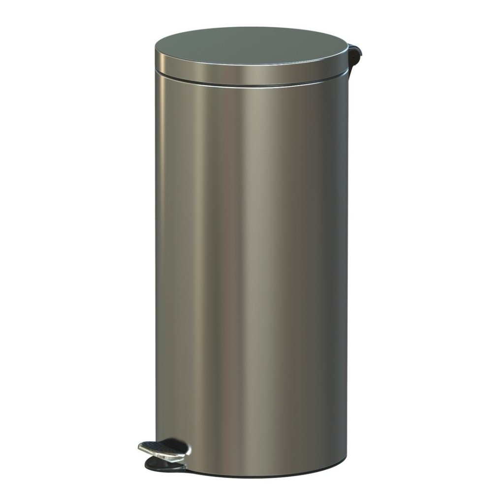 Trash step-on bin with a volume of 30 l. Various designs. Foot pedal control. Integrated handle for easy handling in the lid. The lid is equipped with a vertical lock. Black inner removable plastic container.