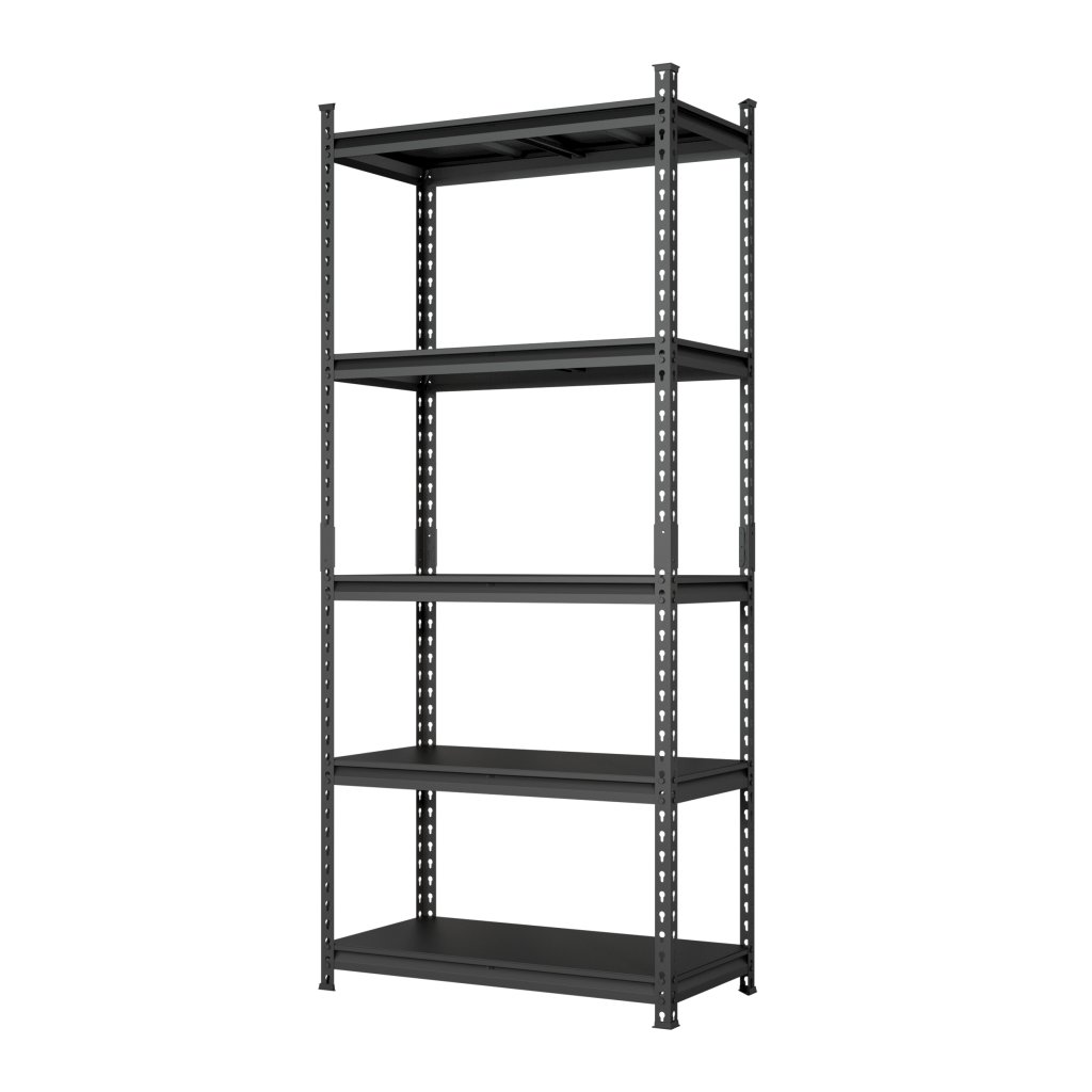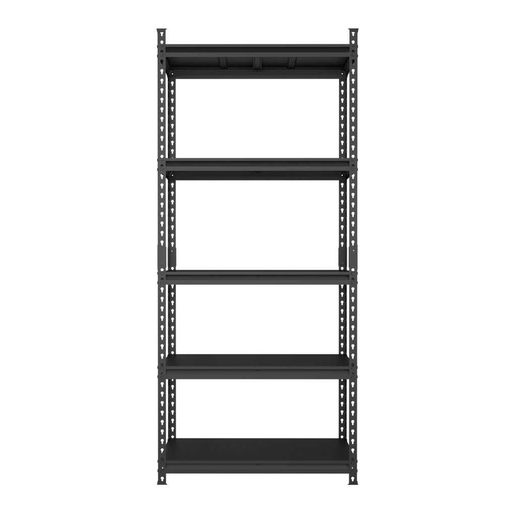 Universal all-metal screwless shelf suitable for workshops, warehouses, offices, garages or archives. Made of high-quality steel sheet, surface treated with black powder paint. 5x adjustable shelves with reinforcement. Shelf load capacity 175 kg. Shelf dimensions (h x w x d) 1830 x 800 x 500 mm. Supplied disassembled.