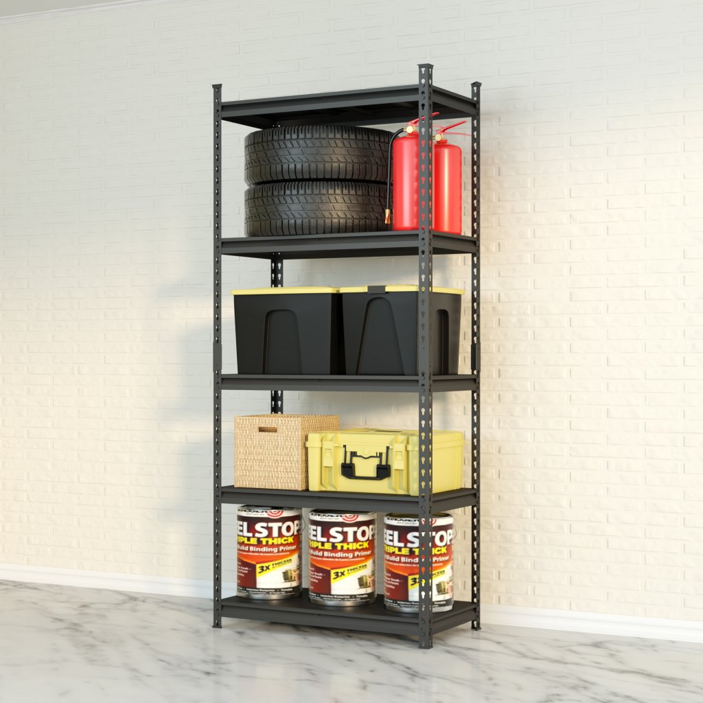 Universal all-metal screwless shelf suitable for workshops, warehouses, offices, garages or archives. Made of high-quality steel sheet, surface treated with black powder paint. 5x adjustable shelves with reinforcement. Shelf load capacity 175 kg. Shelf dimensions (h x w x d) 1830 x 900 x 500 mm. Supplied disassembled.