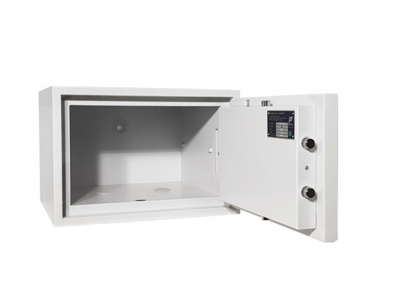 Double-shell furniture safe in non-certified security class S2. Height 300 x width 445 x depth 400 mm, locking with key or electronic code, color RAL 7035 light grey.