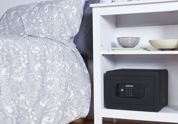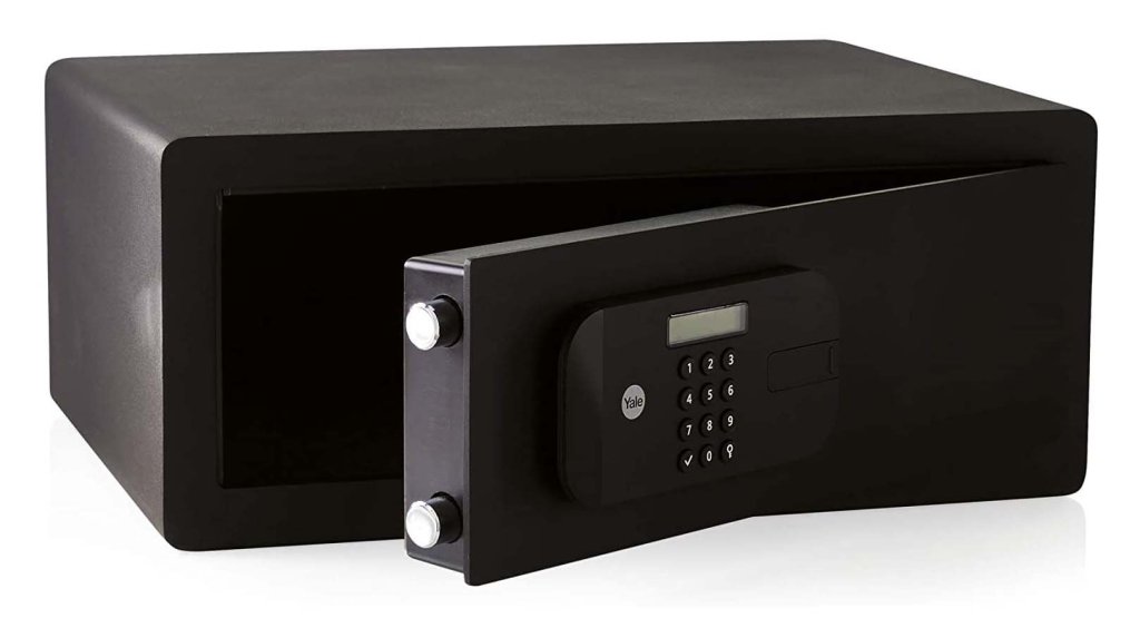 Yale Guest Small furniture safe, electronic code locking, blue backlit display, lever double-sided locking system. Height 200 x width 310 x depth 200 mm, internal dimensions 197 x 307 x 137 mm.
