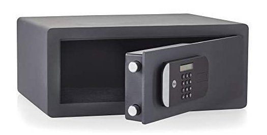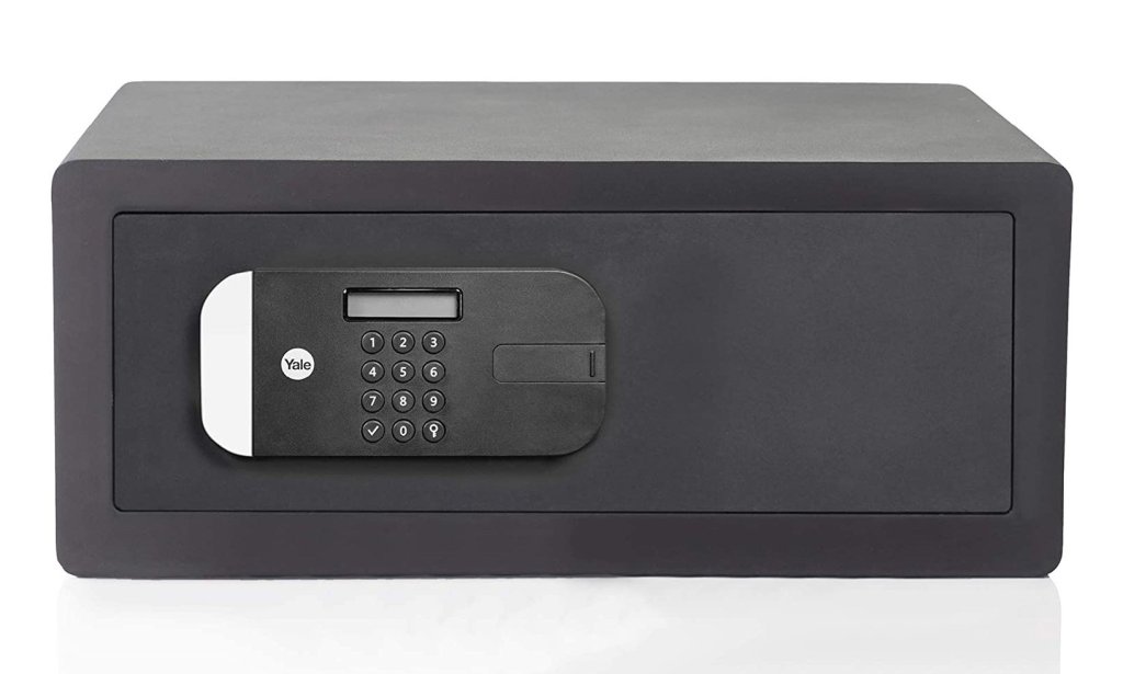 Yale Guest Laptop furniture safe, electronic code locking, blue backlit display, lever double-sided locking system. Height 200 x width 430 x depth 350 mm, internal dimensions 197 x 427 x 287 mm, suitable for a laptop.