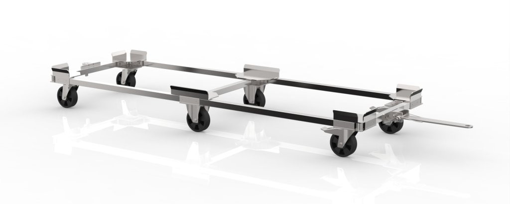 A handling cart for EURO pallets with a drawbar that allows multiple carts to be connected in a row (the so-called Milk-run system). The cart is suitable for various handling purposes in warehouses and workshops. With its high load capacity of 750 kg, it is ideal for transporting heavier items. The cart includes 2 swivel castors with brakes and 2 swivel castors without brakes, each with a diameter of 125 mm, enabling easy handling of items. The dimensions of the cart are 1240 x 840 x 238 mm. ESD version available.